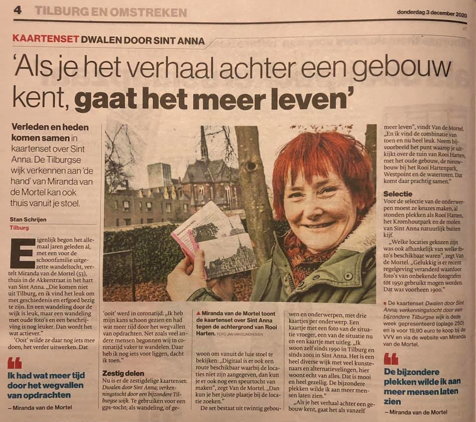 Miranda van de Mortel heeft door middel van kaartjes een wandelroute uitgestippeld door Sint Anna. Door het gebruik van oude foto’s wil ze alle wandelaars actief betrekken bij de wijk. Door haar passie voor geschiedenis en een familiedag in het verschiet ...